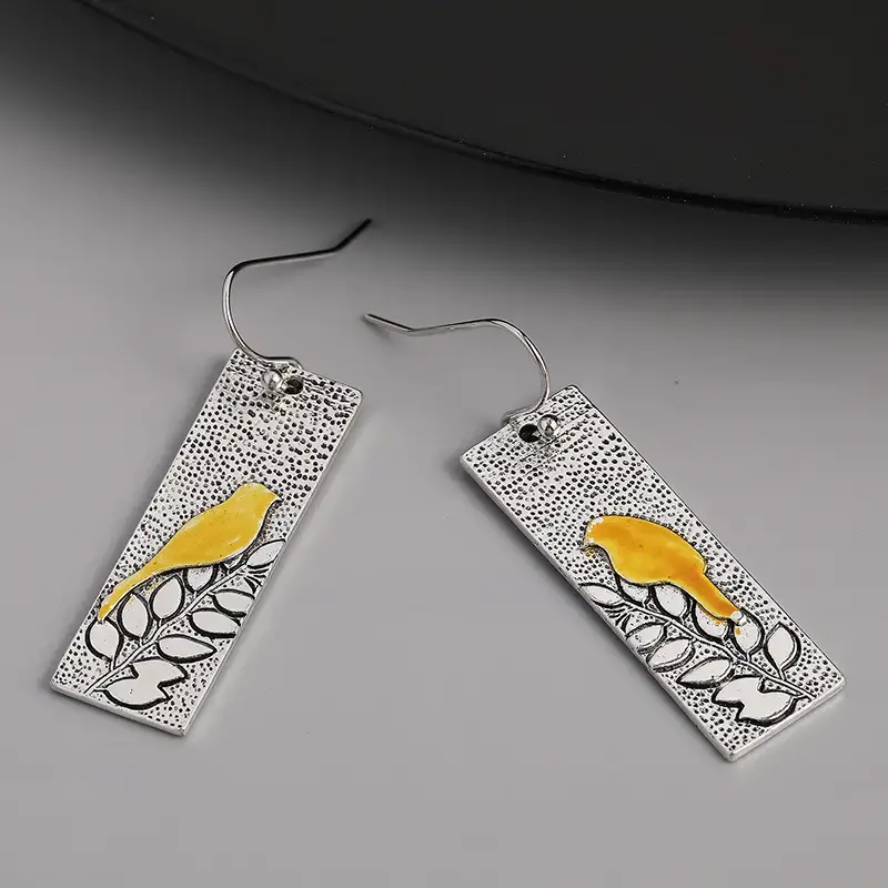 Retro Vintage Rectangle Shaped Leaf Cute Bird Pattern Dangle Earring