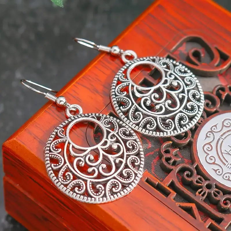 Retro Style Antique Silver Ring Hollow Pendant Ethnic Style Earrings